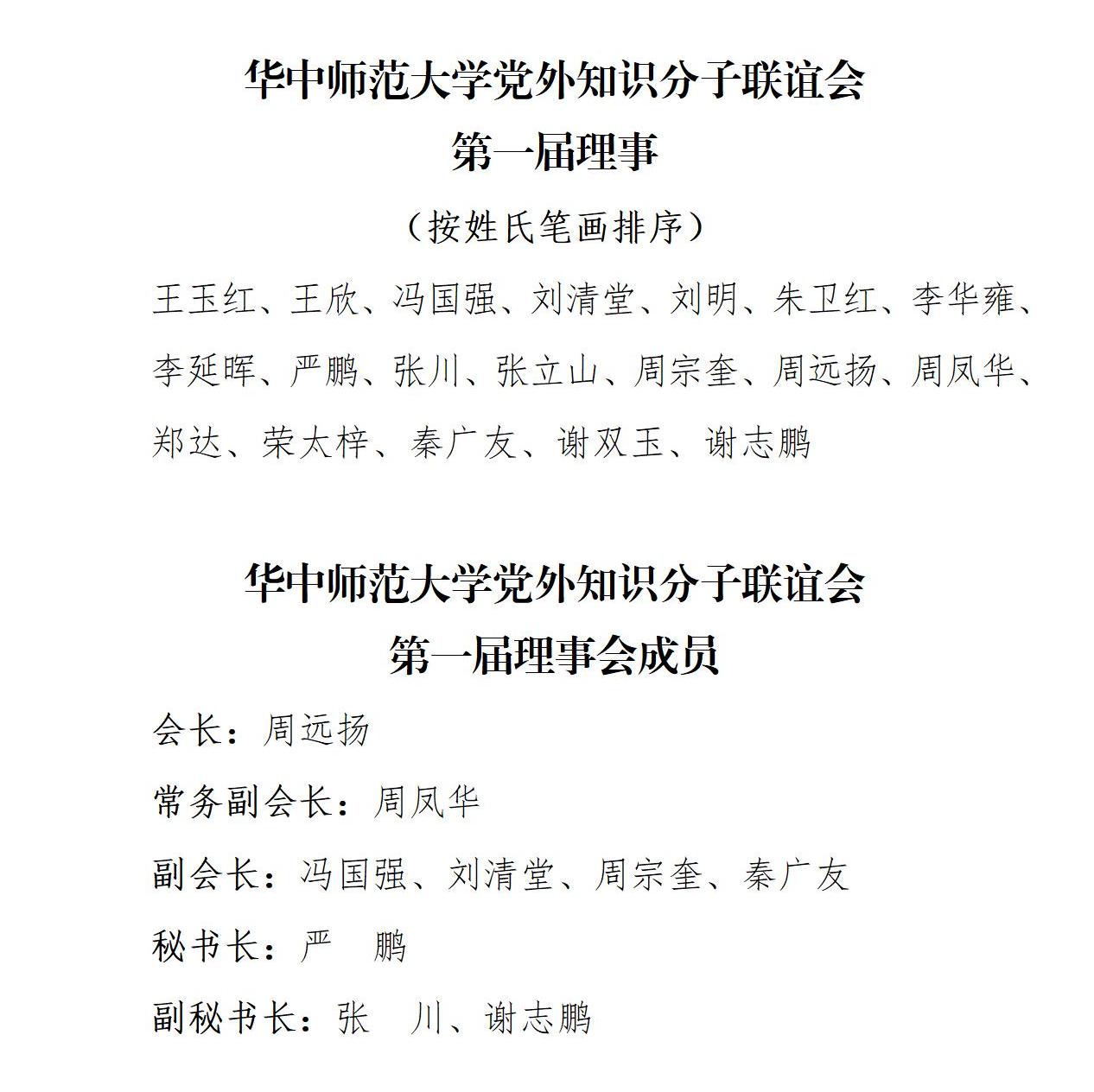 大会审议并通过了《华中师范大学党外知识分子联谊会章程》和《华中师范大学党外知识分子联谊会第一次会员代表大会选举办法》,表决产生华中师范大学党外知识分子联谊会第一届理事,选举产生华中师范大学党外知识分子联谊会(以下简称“知联会”)第一届理事会会长、常务副会长、副会长、秘书长和副秘书长。