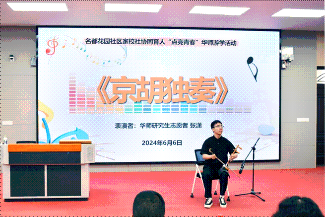 最后,华师音乐学院大四学生蔡金霖独唱了歌曲《有我》,华师马院研究生志愿者张潇带来了精彩的京胡独奏《夜深沉》,既展现了新青年之声,也展示了中华优秀传统文化,将活动推至高潮。