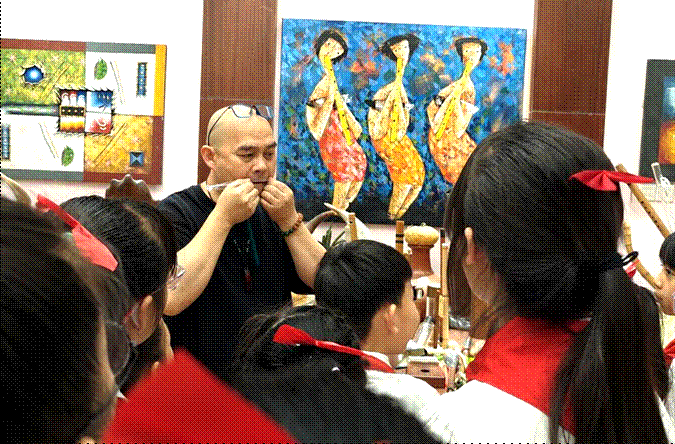 活动前期,师生们来到赵洪啸老师的创意乐器陈列室。在赵老师充满童趣的讲解下,同学们了解到这间工作室里陈列的形态各异的稀奇乐器类别和来源,有赵老师自己复原的三国乐器呜嘟,有西藏人骨制作的骨笛,有新疆的狼头鼓,有透明悠扬的水晶坛,有马来西亚的笛……
