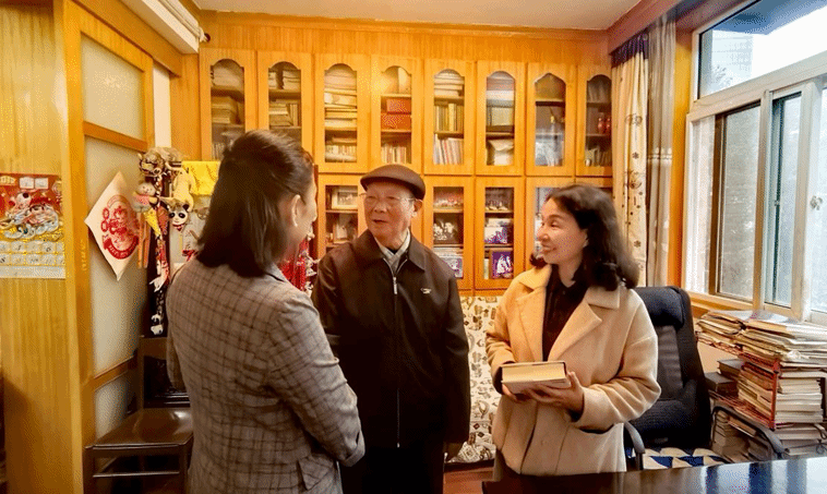 最后拜访的是95岁高龄的郭文安老师家。郭老师家的见面场景更是别开生面。门刚打开,未等委员们开口问候,老人便迫不及待地将大家引至书房,指着书桌上由王道俊先生和他自己联袂主编、去年底在日本正式出版发行的《中国教育学》,脸上洋溢着无比的喜悦。这是中国教育学著作首次成功译介至日本,标志着中国教育学成果走向更广阔的国际舞台。在分享这份喜悦时,老人与委员们共同沉浸在深沉的学术自豪之中——为自己毕生耕耘的学问能冠以“中国”之名而骄傲。现场气氛热烈,熊主委不禁风趣赞叹:“这便是学术中人所追求的永恒价值与不朽贡献啊!”
