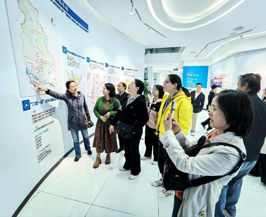 姚家山基地活动结束,会员们余兴未尽。恰好返程要途经学校刚刚协议落成的盘龙城新校区,委员会决定乘兴围绕“同心筑梦”为主题,带领大家顺道前往盘龙城观摩华师新校区。在盘龙城黄陂规划展示馆,大家认真听取了新校区建设及施工单位对新校区的完整规划,接待中心相关人员在新校区沙盘前给大家详细介绍了校区规划和建设特点。