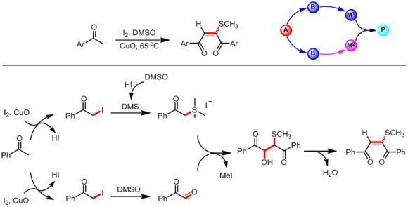 课题组以经典的“碘-二甲亚砜”组合试剂体系为突破口,取得了奠基性的研究成果。他们发现,简单易得的芳基乙酮在这一体系下,能上演一场精彩的“分子分身术”并历经“氧化反应序列”与“还原反应序列”的自分类汇聚过程:一部分起始物分子被碘化生成α-碘代酮并进一步被氧化成酮醛;另一部分历经碘化反应并与体系内产生的二甲硫醚反应生成锍盐。最终,酮醛与锍盐这两路“兵马”胜利“会师”,发生高效的Aldol类型反应,汇聚合成出结构新颖的1,4-二酮类化合物(图2)。