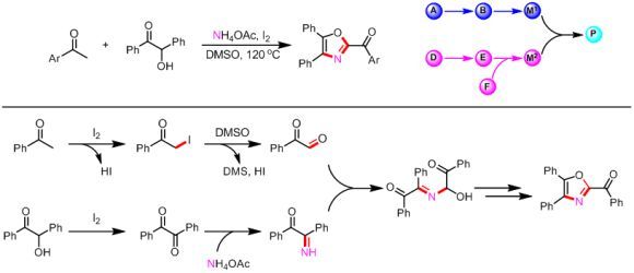 例如,课题组设计了芳基乙酮与安息香两种底物共存的体系。在“碘-二甲亚砜”环境下,芳基乙酮循着熟悉的路径走向酮醛中间体;与此同时,安息香则独立地经历氧化、并与醋酸铵缩合,生成另一种活性中间体。最终,这两条平行线上产生的中间体发生高效的交叉捕获与环化,优雅地“组装”成全取代的噁唑类化合物。这一过程生动诠释了“自分工”的精髓:不同原料各有专攻,路径清晰,并在预设的“接口”完美对接(图3)。