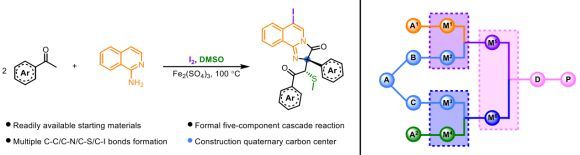 在一个代表性的工作中,芳基乙酮、氨基异喹啉在“碘-二甲亚砜”体系中,经历了至少三个平行反应序列,产生了至少三种关键的活性中间体。这些中间体在反应锅中上演了精彩的“三重交叉捕获”大戏,通过连续、有序的分子间反应,最终汇聚成一个结构精巧且带有可修饰“把手”(碘原子、甲硫基)的咪唑并异喹啉化合物。整个过程宛如一场预设了多重精密触发的化学多米诺骨牌,环环相扣,一气呵成(图4)。
