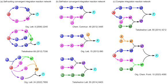 这就是更为复杂的“自分工汇聚集成反应网络”,在这个模型中,两种或多种不同的底物同时开启各自平行且独立的串联反应旅程,分别生成特征性的中间体。这些原本“素不相识”的中间体,在反应体系的精密安排下,能够在特定时刻相互识别、交叉反应,实现“异源汇聚”。
