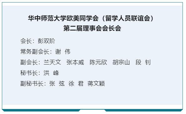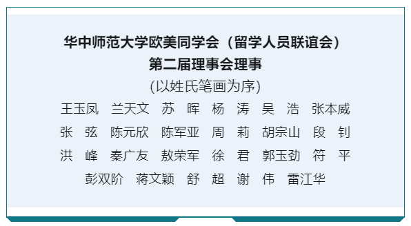 华中师范大学欧美同学会围绕中心、服务大局,配合学校的发展,以理事会为执委会团结带领我校留学回国人员开展了各项工作以及联谊活动。主要任务为: